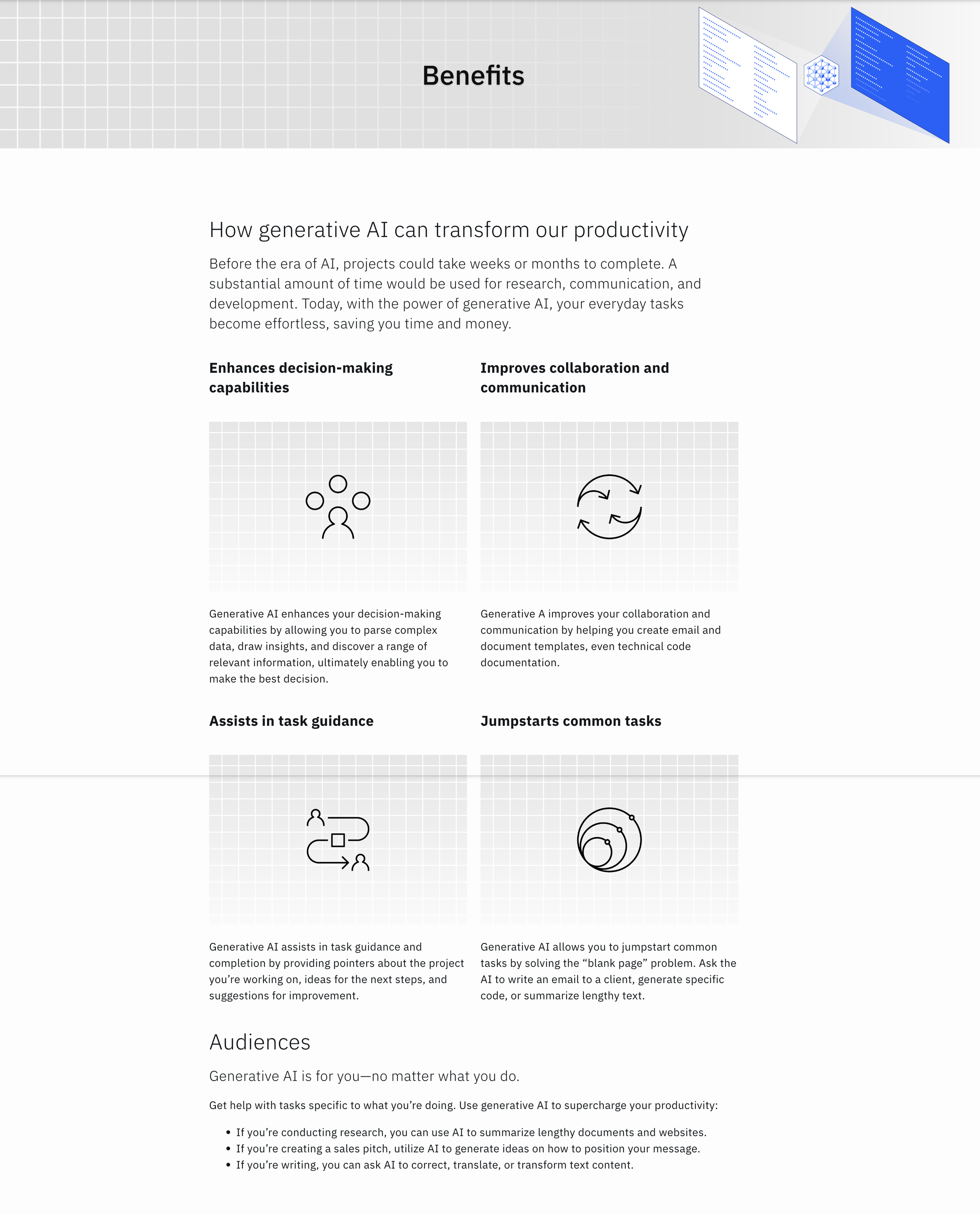 Next, I created content on the benefits of generative AI. I made sure to tailor the content to IBM-specific jobs to showcase how it can help IBMers work smarter right now.